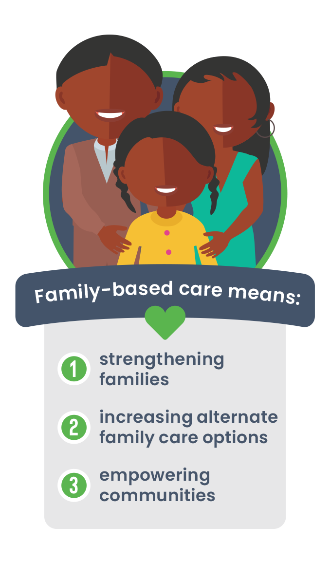 Family-based care focuses on ensuring children grow up in safe, stable, and nurturing relationships. This can include strengthening families so children can remain at home, or developing alternative family care options when needed.